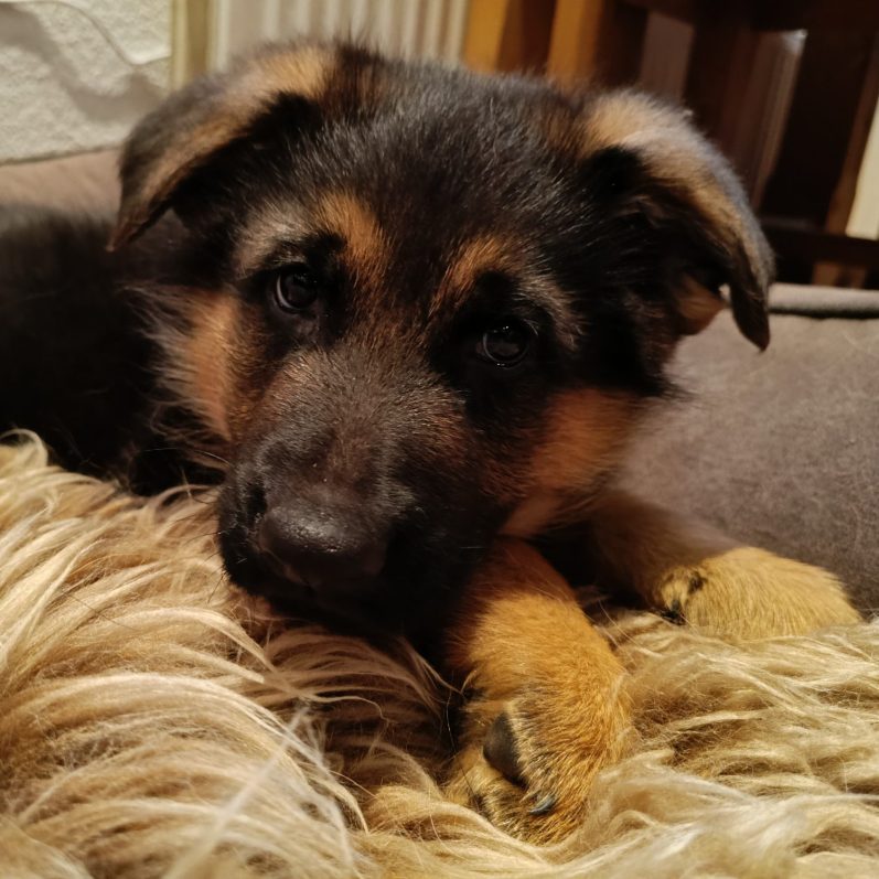 Den erhöhten Nährstoffbedarf erhalten sie automatisch über die erhöhte Futtermenge. Du glaubst gar nicht, wie viel in so ein kleines Tier reinpasst. Gefühlt habe ich mit Freya einen Dinosaurier großgezogen. Ein großes Problem in der Welpenaufzucht ist die Überversorgung. Zu viel begünstigt ein schnelles Wachstum. Zu schnell — die Knochen kommen nicht hinterher. Keine Sorge: Die Endgröße und das Gewicht sind genetisch bedingt. Das kann man mit Futter nicht beeinflussen, sonst hätte ich einen T-Rex im Garten! Freya ist im Gegensatz zu meinen vorherigen Welpen ganz gleichmäßig gewachsen. Andere Welpen wachsen mal vorne hoch oder haben ein Keilfahrwerk. Manchmal bleiben sie leider auch so. Freya dagegen sah schnell aus wie ein Schäferhund im Miniformat und hat sich zu einem stattlichen Schäferhund entwickelt.